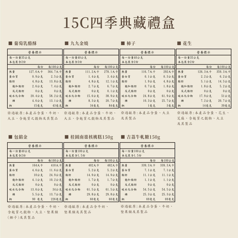 40g/入。葡萄乳酪酥2(35g/入)+九九金燒2+柿子2+花生2(35g/入)+包餡金2+南棗核桃糕150g+牛軋糖150g