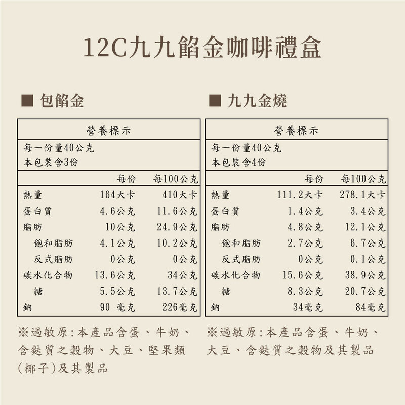 40g/入。包餡金3+九九金燒4+香醇咖啡3包(濾掛式)+果香咖啡3包(濾掛式)