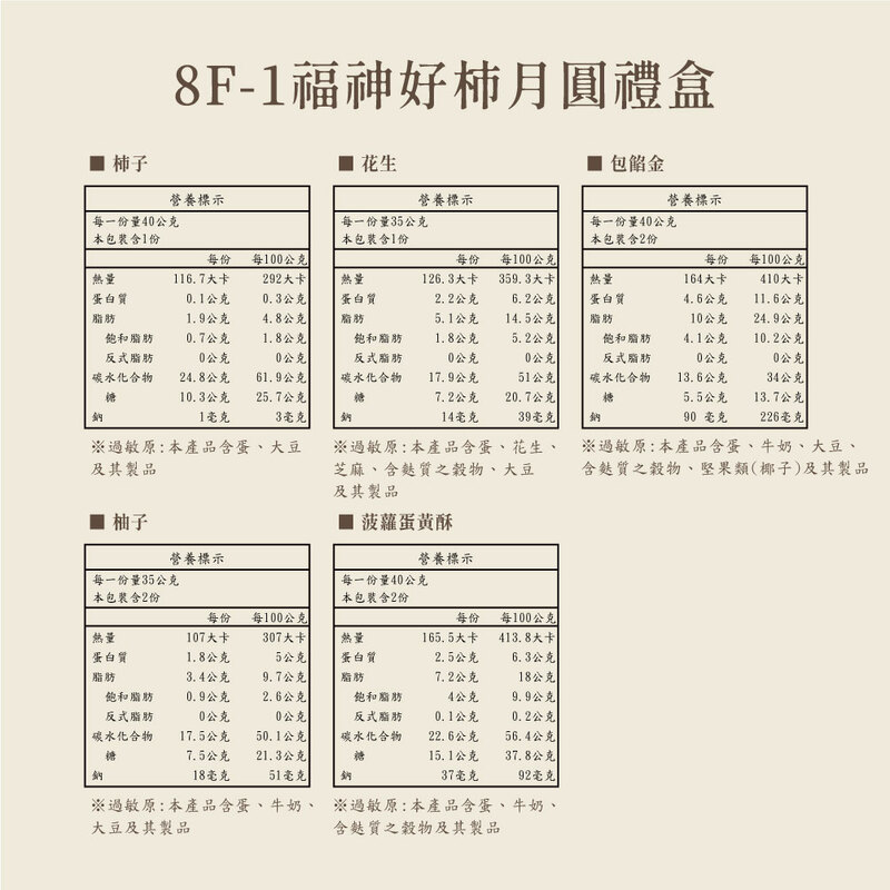 40g/入。柿子1+花生1(35g/入)+包餡金2+柚子2(35g/入)+菠蘿蛋黃酥2